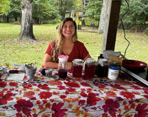 Martina Maya Callen was the Artist in Residence at Catoctin Mountain Park September 4-25, 2025. Martina is a 2-dimensional artist from Laurel, MD. During her residency, Martina experimented with the “alchemy of nature” and crafted her own watercolor pigments using plants, seeds, leaves and berries found locally. Reminiscent of the Hudson River School painters who captured the beauty of the wilderness and were instrumental in the formation of the National Park Service, Martina plans to create artwork that is not only inspired by the park but is physically made from the local community—deepening the connection between art, nature and environmental responsibility. During her residency, Martina did two public presentations. Her September 17th presentation was held on the porch at the Thurmont Library where she talked about her work for environmentalism, naturalism and community wellness. She pointed out the importance of being outdoors and had participants make “intention jars” with leaves, herbs, flowers and oils. Each combination of ingredients was formulated for the “intention” of calmness, sleep, focus or energy. At the end of the session, she led a guided meditation where we listened to the sounds of the night (rain on the roof, crickets and tree frogs) and were led to a very peaceful place.